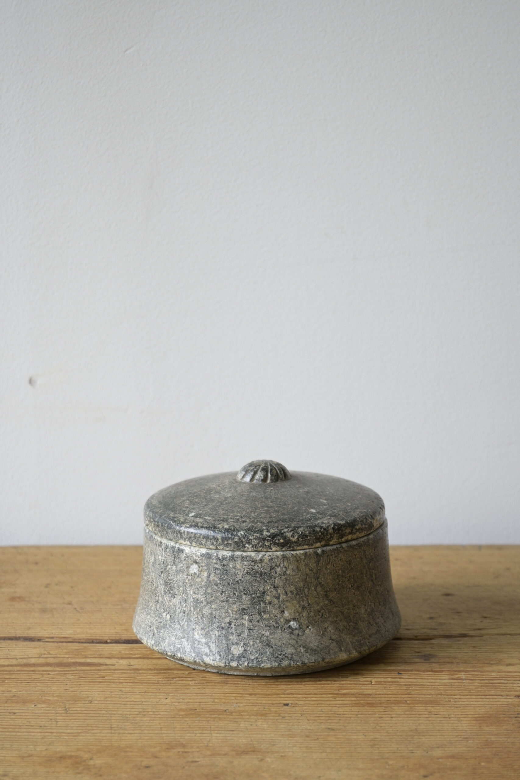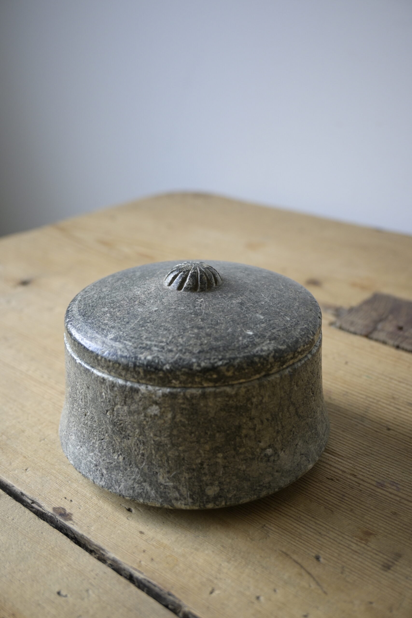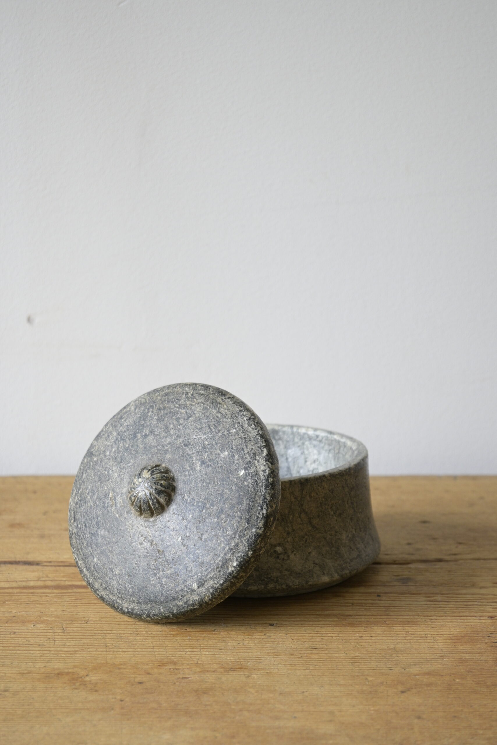 Made of Swedish soapstone with beautiful carving on the lid.