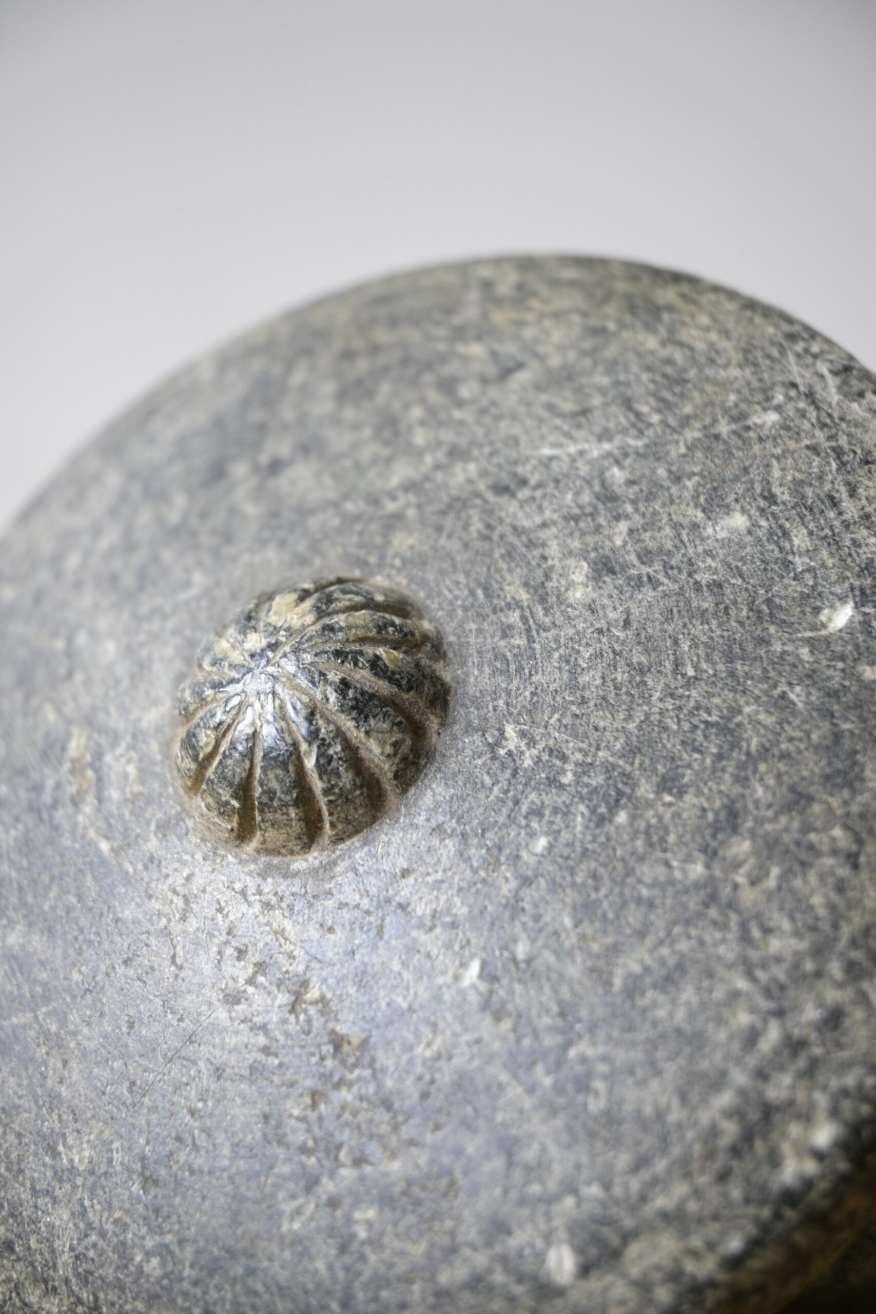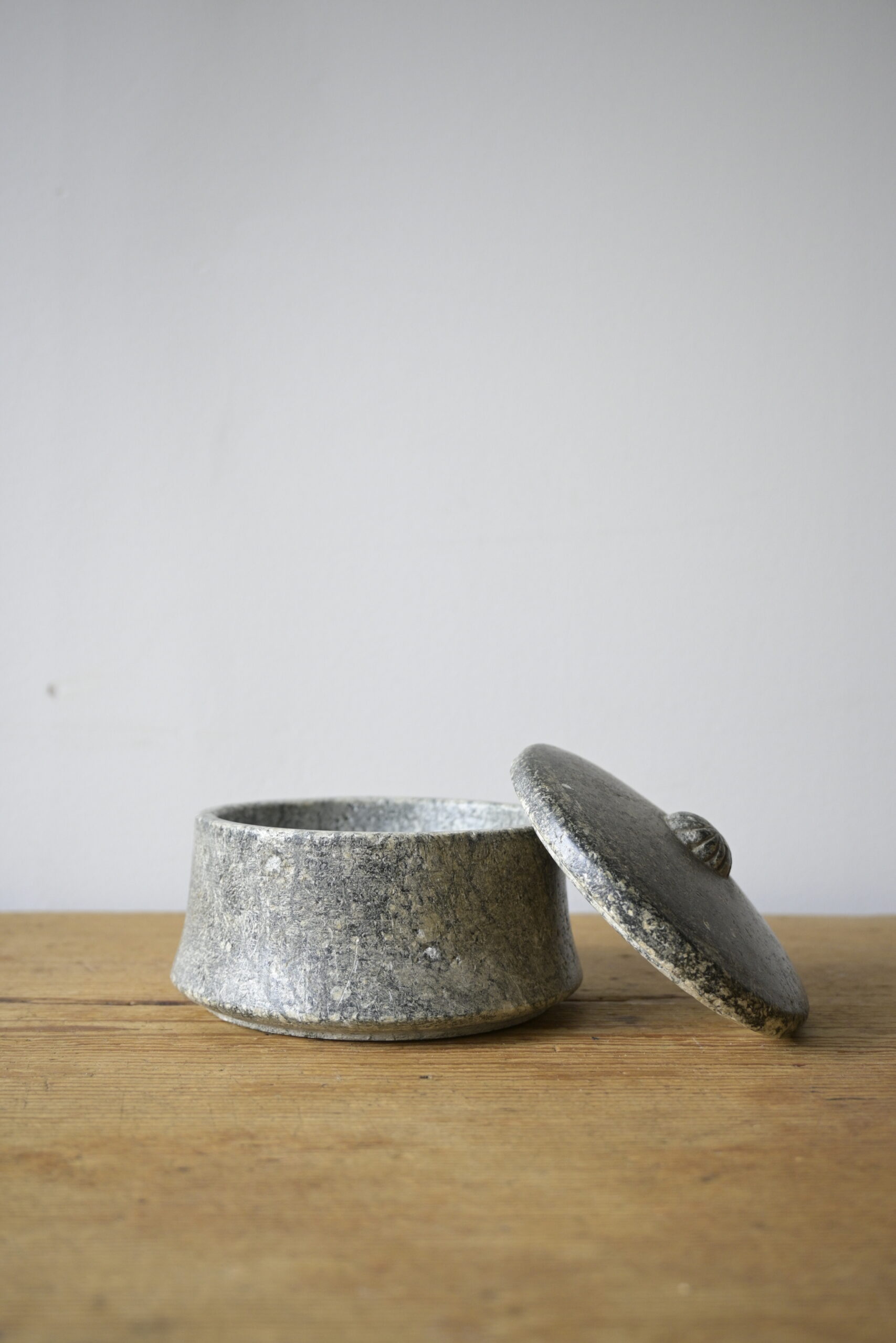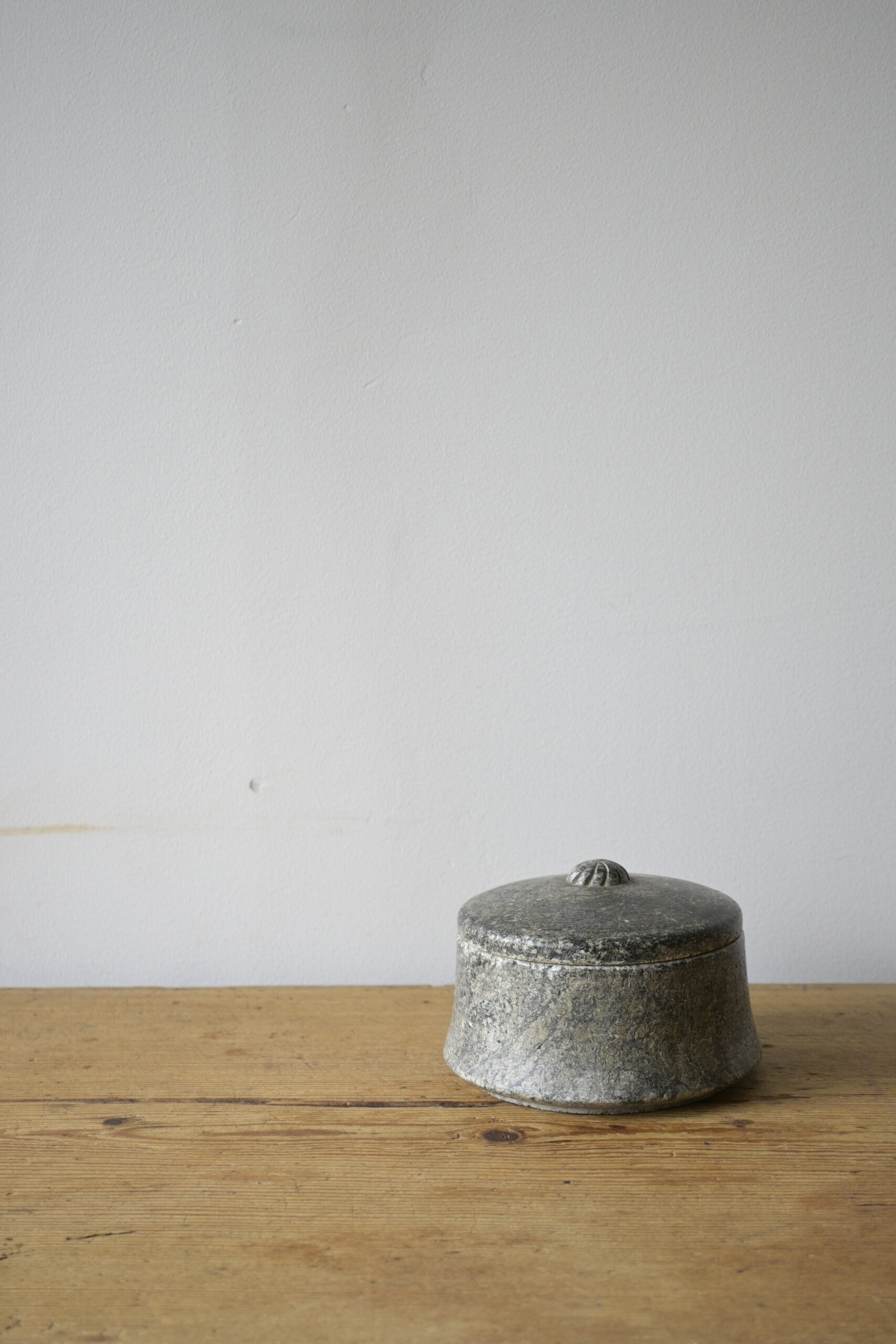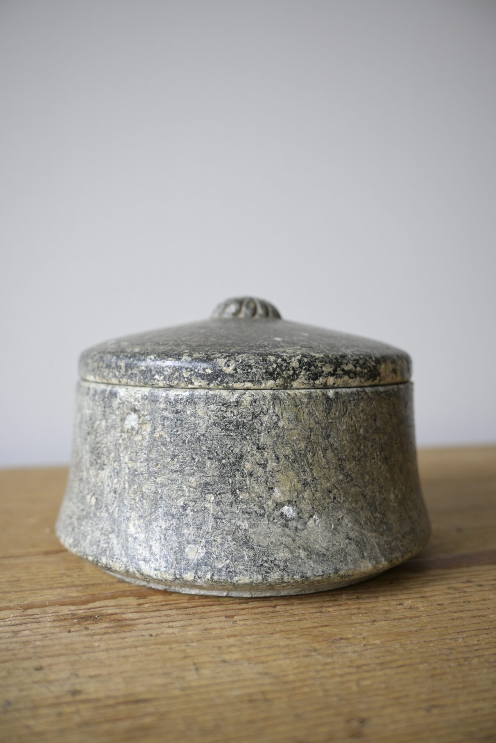 Made of Swedish soapstone with beautiful carving on the lid.